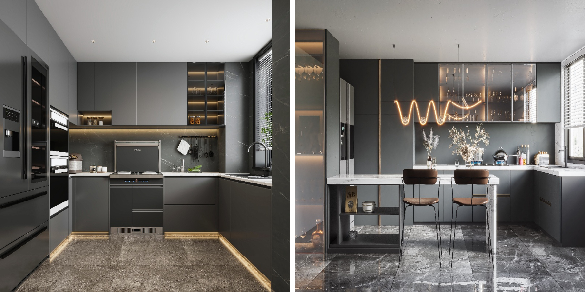 1. Os armários de cozinha cinzento-claro combinam perfeitamente com todos os estilos de decoração de interiores.